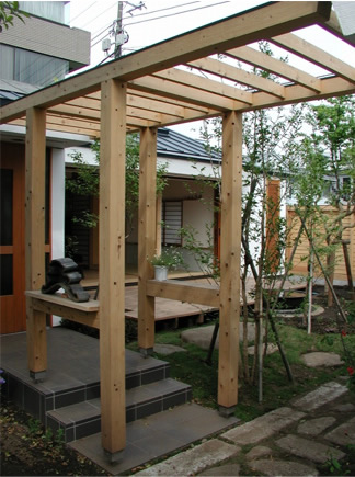 来訪者は木製の塀に設けた木戸を開き中庭を通り、木製パーゴラの下をくぐってリビングとダイニングの間に設けた玄関からアプローチする事になる。太陽熱利用のOMソーラーを採用しており平屋である事もあって理想的な条件で利用できたため、冬でもほぼOMソーラーのみで過ごせる。また建築主の意向もあり子供時代の想い出の残る旧宅の、柱・梁の構造材、建具などの部材を積極的に再利用している。